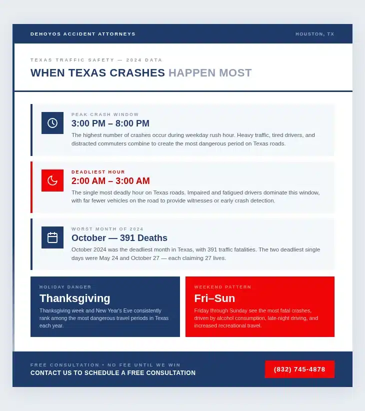 Most crashes happen during afternoon rush hour between 3:00 p.m. and 8:00 p.m. on weekdays. However, fatal crashes peak late at night between 9:00 p.m. and 3:00 a.m., especially those involving alcohol impairment.